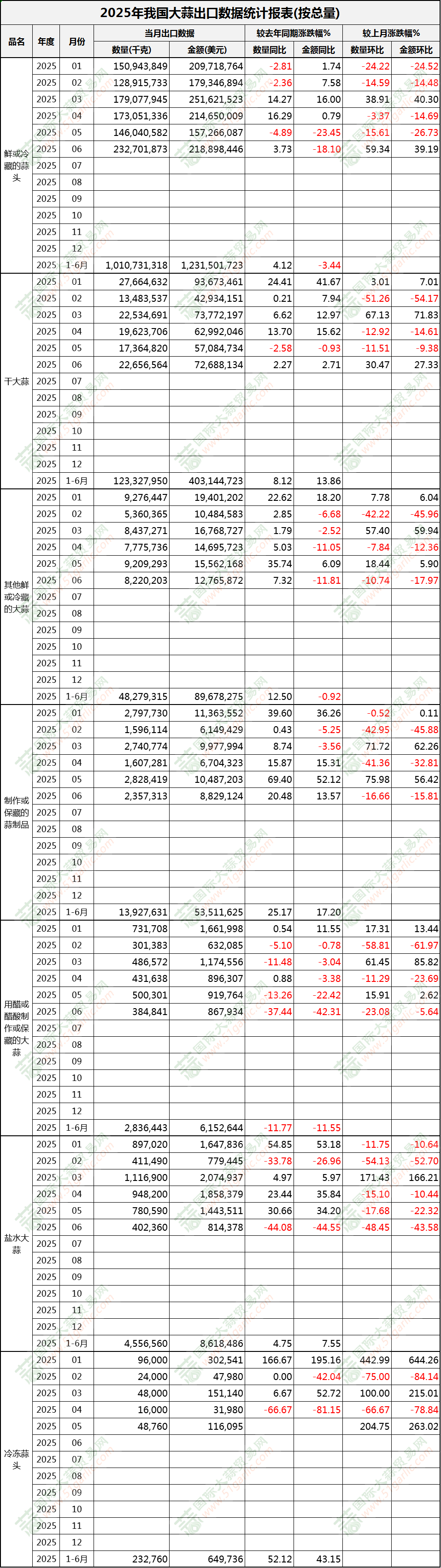 2025年6月大蒜出口數(shù)據(jù)(按總量)