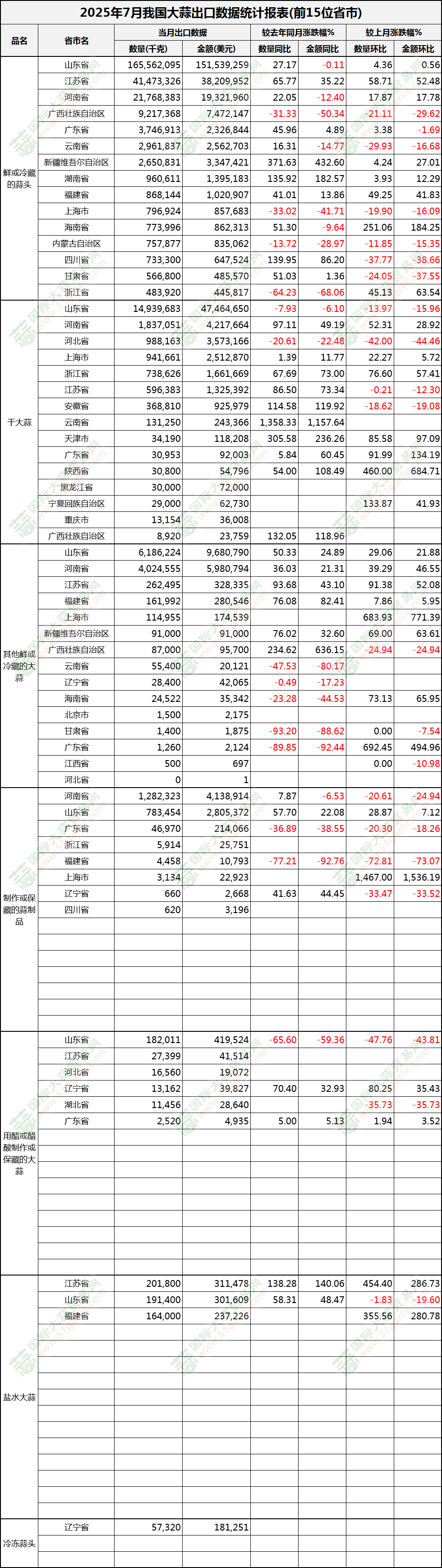 2025年7月大蒜出口數(shù)據(jù)(按省市)