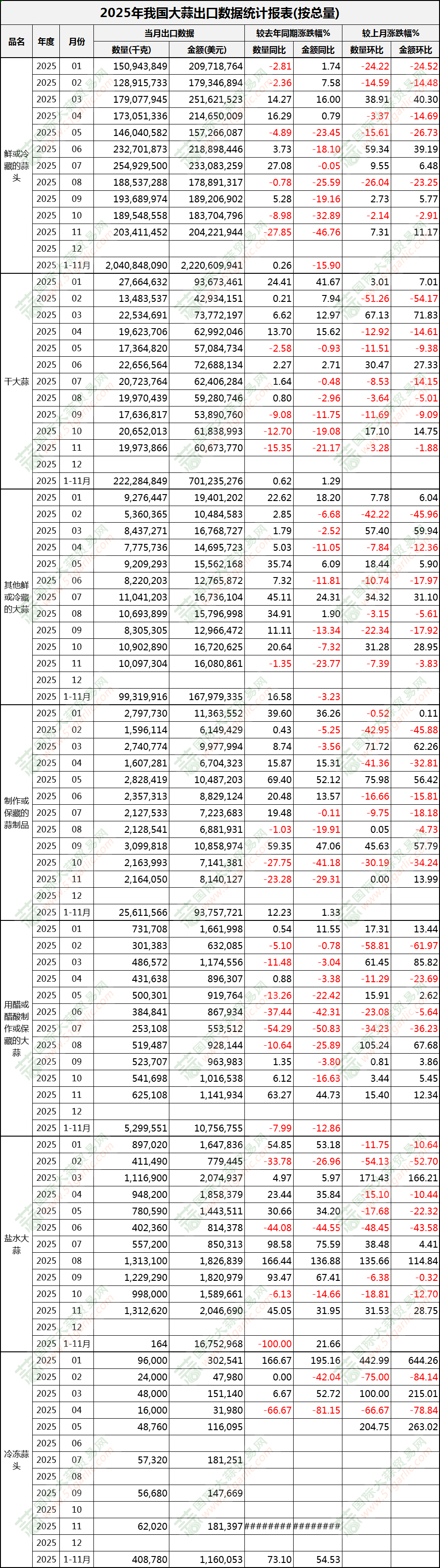 2025年11月大蒜出口數(shù)據(jù)(按總量)