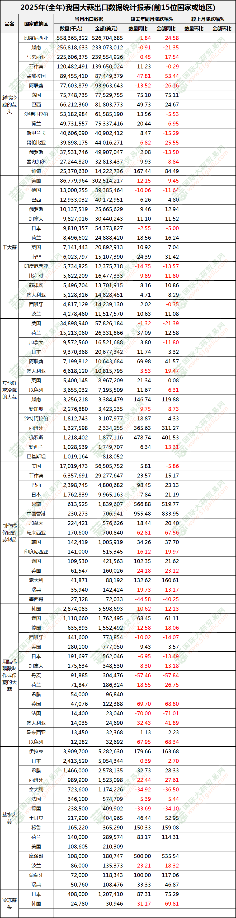 2025年全年大蒜出口數(shù)據(jù)(按國家)