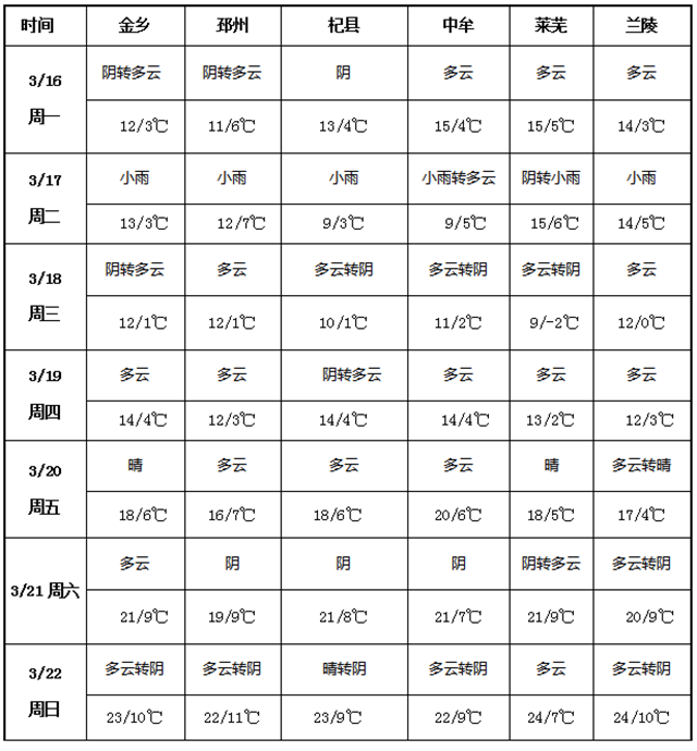 3月16日-22日,山東金鄉(xiāng)、邳州、萊蕪、蘭陵及河南杞縣、中牟等大蒜主產(chǎn)區(qū)天氣以陰天多云穩(wěn)為主、晴好天氣較少,氣溫冷暖交替。16-17日以陰天、多云為主,其中金鄉(xiāng)、邳州、杞縣、中牟、蘭陵均有小雨過程,氣溫小幅回落,最低溫普遍在3-6℃,最高溫12-15℃;18-19日轉(zhuǎn)為陰轉(zhuǎn)多云或多云天氣,最低溫降至 1-4℃,部分區(qū)域(如萊蕪、蘭陵)最低溫逼近 0℃,晝夜溫差顯著拉大;20-22日天氣大幅轉(zhuǎn)好,金鄉(xiāng)、萊蕪迎來晴天,其余產(chǎn)區(qū)為多云或多云轉(zhuǎn)陰,氣溫顯著回升,最高溫升至 18-24℃,最低溫也回升至 7-10℃,整體濕度隨晴好天氣逐步降低。