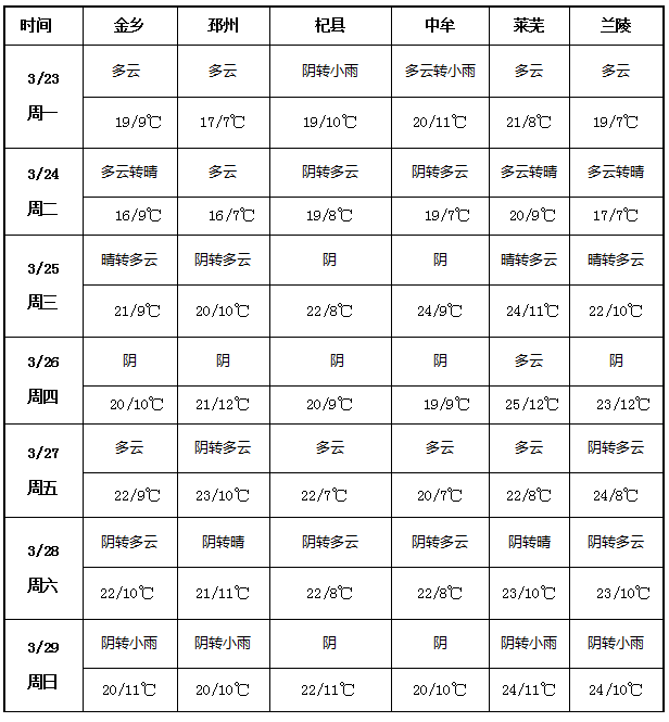本周(3月23-29日),金鄉(xiāng)、邳州、杞縣、中牟、萊蕪、蘭陵大蒜主產(chǎn)區(qū)以多云、陰天為主,局部時(shí)段伴隨小雨或晴轉(zhuǎn)多云天氣,整體降水偏少。氣溫方面,各產(chǎn)區(qū)日均最高溫在16-25℃之間,最低溫在6-12℃之間,周內(nèi)氣溫波動(dòng)平緩,無極端高低溫出現(xiàn),整體維持春季適宜的冷暖區(qū)間。