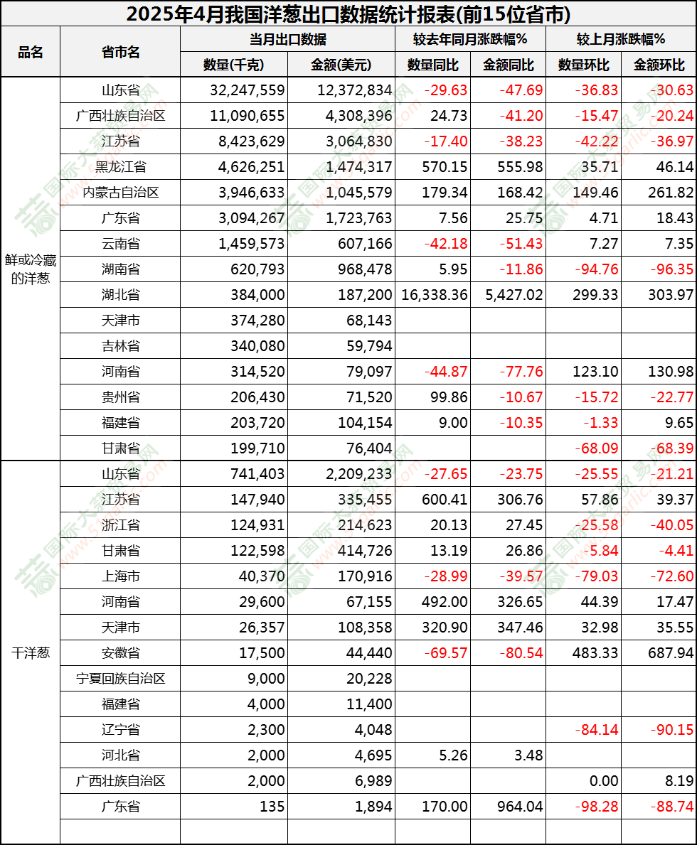 2025年4月洋蔥出口數(shù)據(jù)(按省市)